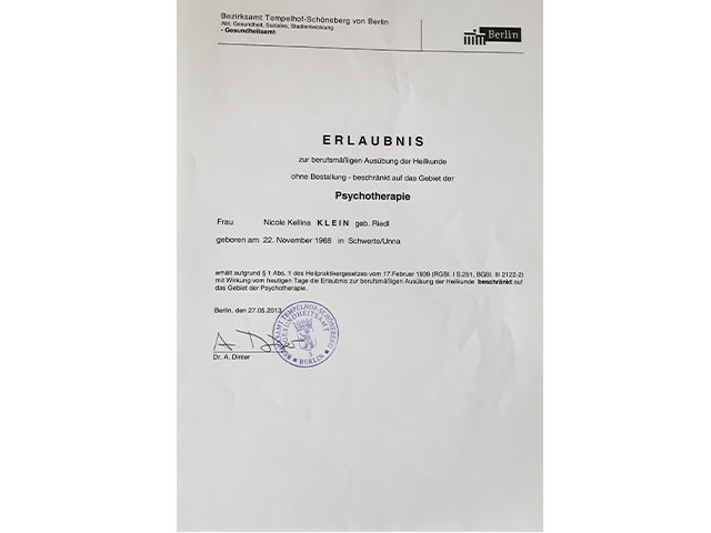 Durchführung und Bestehen der Prüfung „Heilpraktiker für Psychotherapie“, Bezirksamt Tempelhof-Schöneberg, Berlin