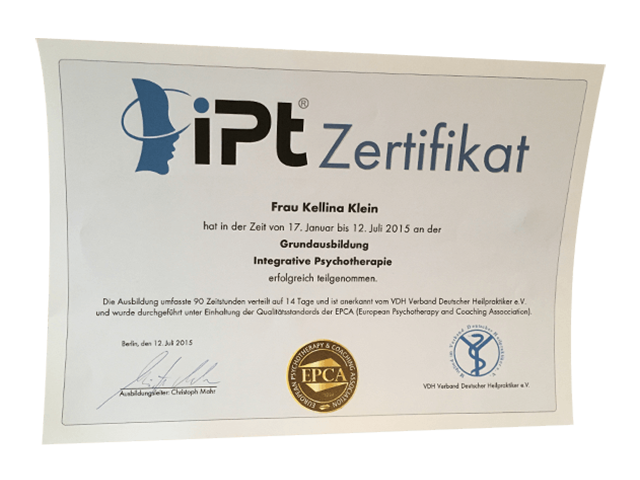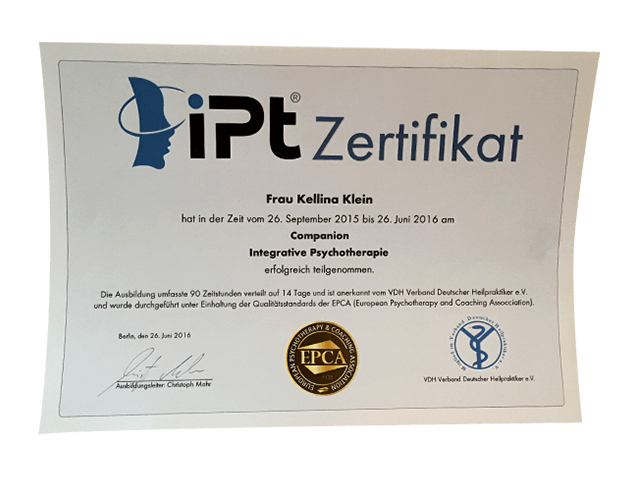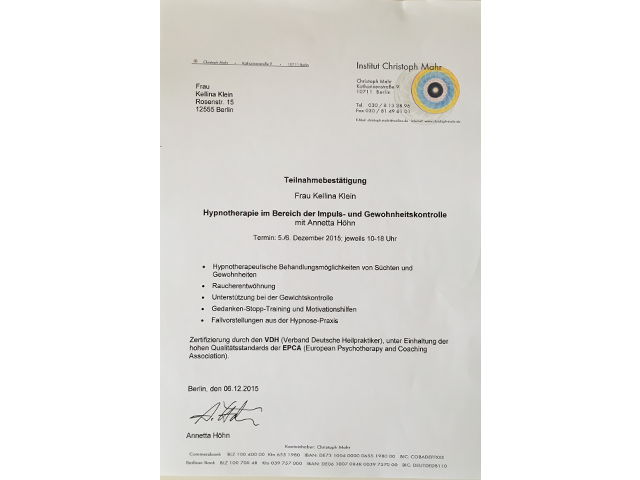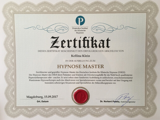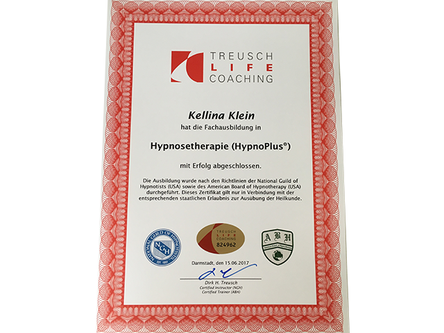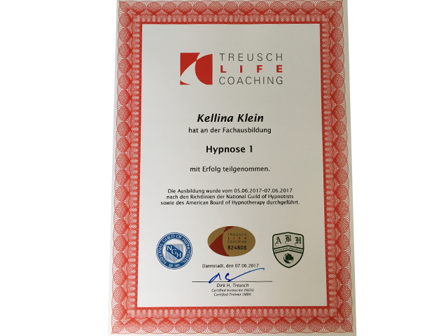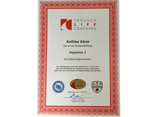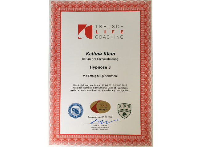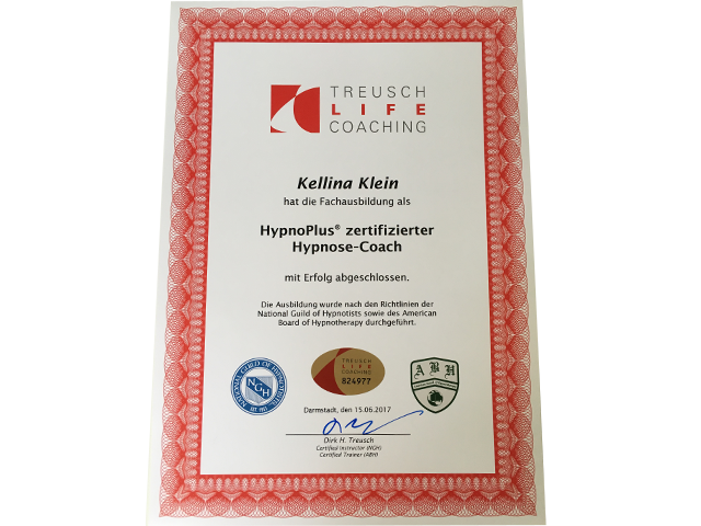 Meine Ausbildungen sind anerkannt von der EPCA (European Psychotherapy and Coaching Assocciation) , meine Hypnose Ausbildungen sind außerdem anerkannt und zertifiziert von der NGH, der National Guild of Hypnotists, der weltweit größten und ältesten Hypnosegesellschaft (USA).