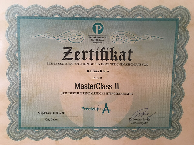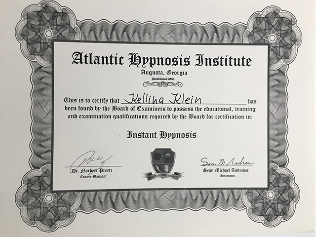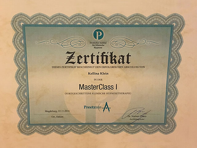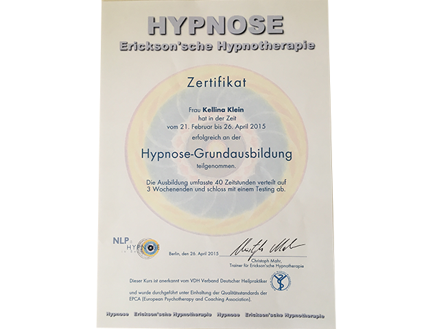 Ich bin zertifizierte Hypnosetherapeutin und staatlich zugelassene Heilpraktikerin für Psychotherapie.